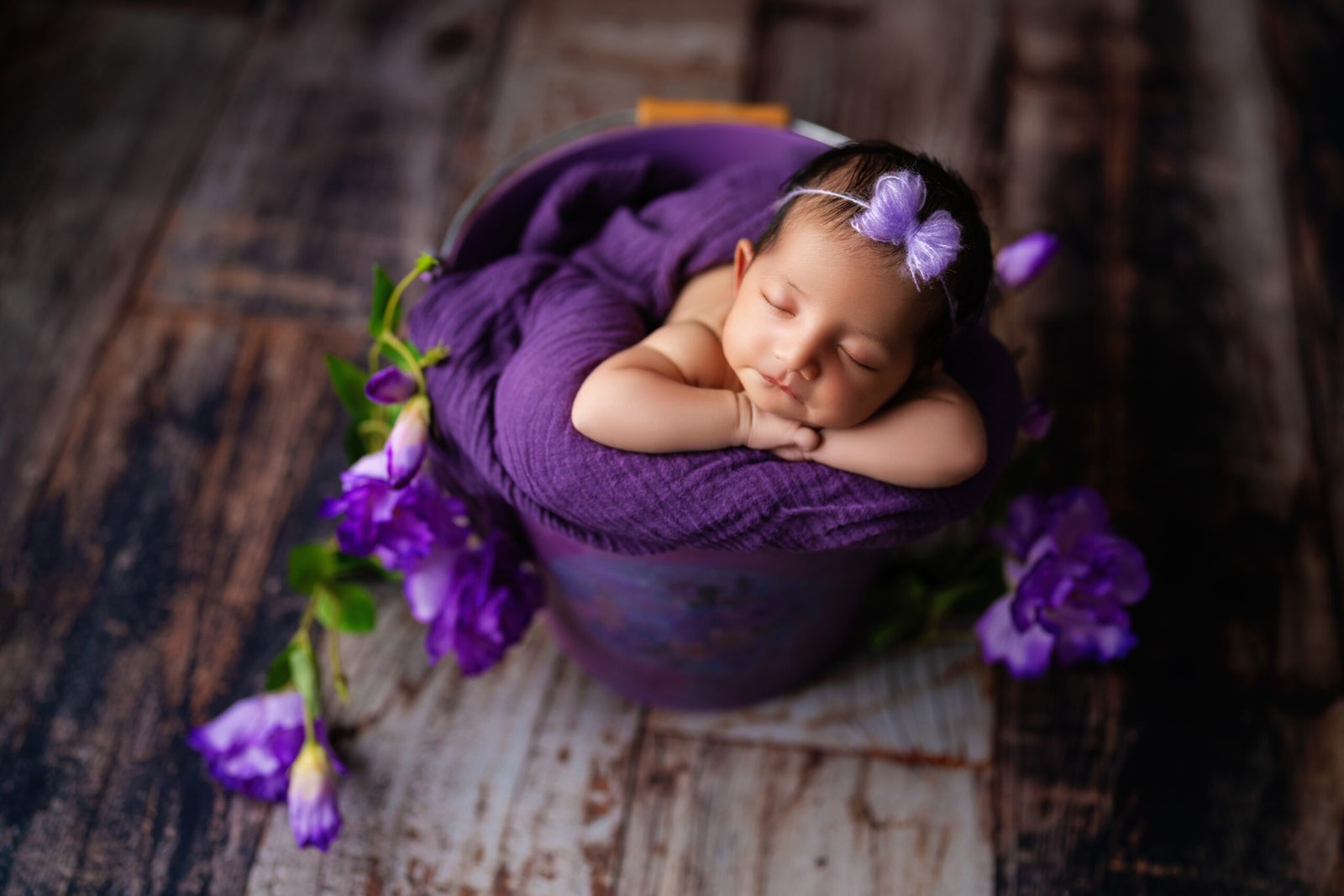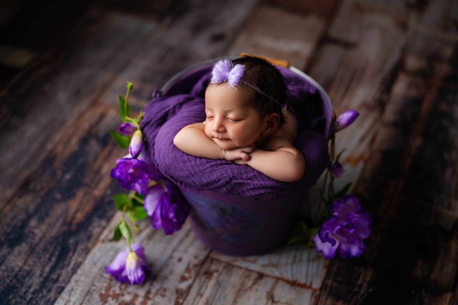Every session includes personalised setups using your preferred colours, textures, and minimal styling. From basket and bucket poses to small bed-style setups, each scene is thoughtfully created to keep the focus on your baby.